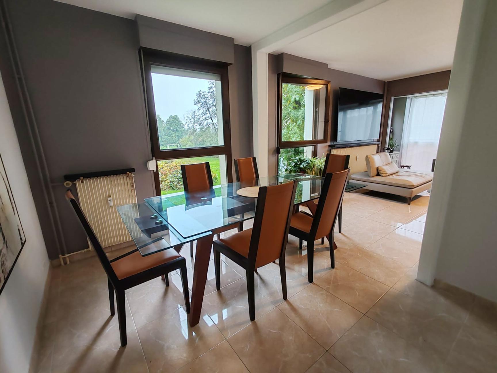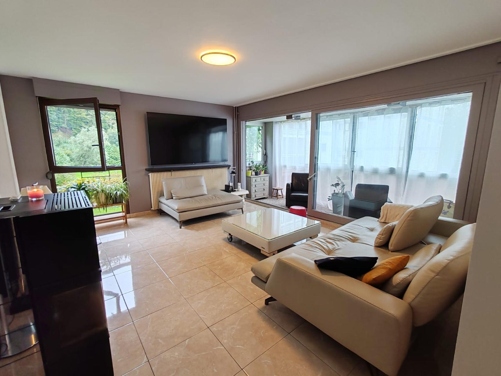 Situé dans un cadre de verdure avec un garage et une cave, bel appartement de type F5 au 1er étage comprenant une entrée avec placard, un salon séjour avec un accès sur la véranda, 2 chambres, possibilité d'en avoir une 3ème, une cuisine équipée, salle de bain avec baignoire et une salle d'eau supplémentaire avec douche, WC. Nombreux rangements.