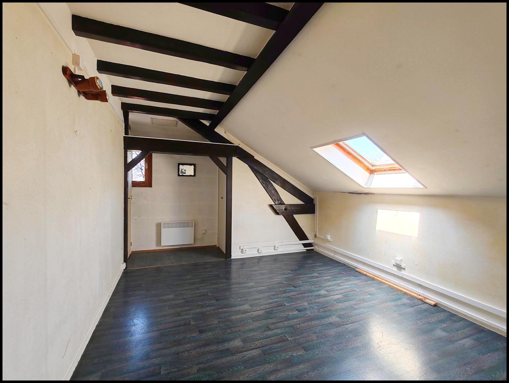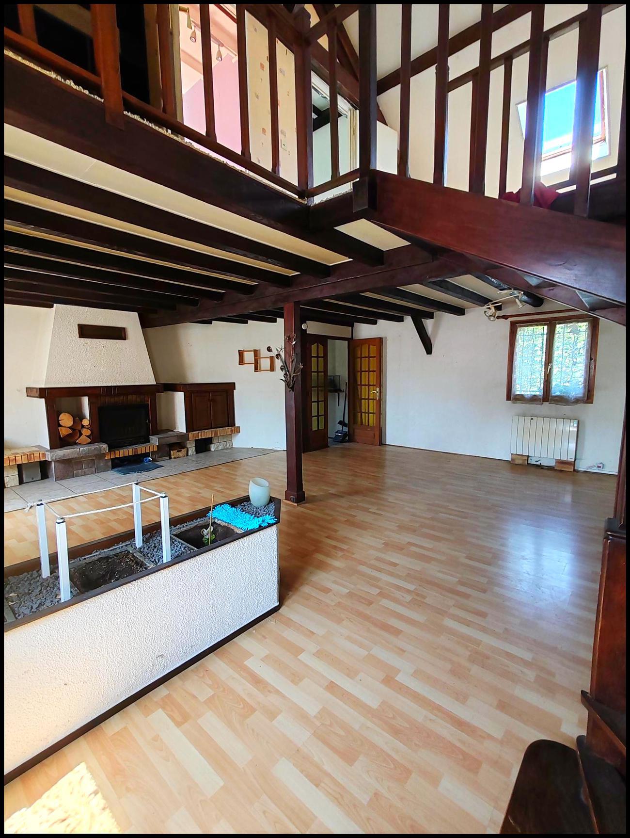 Au 1er étage, salon séjour cathédrale avec une cheminée, cuisine aménagée, toilette et buanderie.